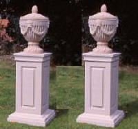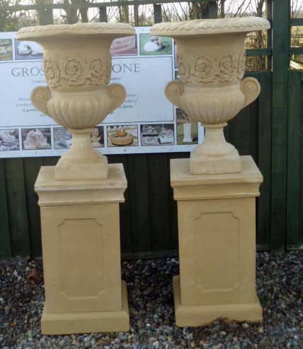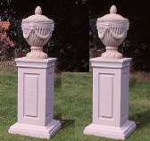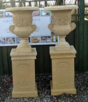 Pair of ex-display Bathstone urns on pedestals, £160.00p + vat.