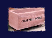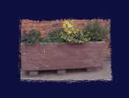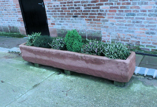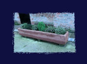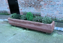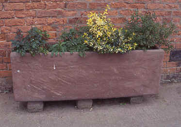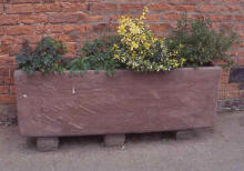A large composite stone planter, this one is our large wall trough and is shown here in a red sandstone finish, if required we can v-cut in to the side either a house name or business name and makes a fantastic personalised planter .