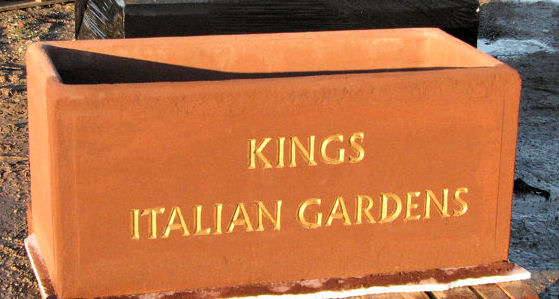 A large composite stone planter, this one is the courtyard and is shown here in a bespoke red sandstone finish, if required we can v-cut in to the side either a house name or business name and makes a fantastic personalised planter .
