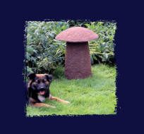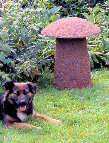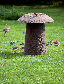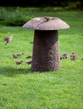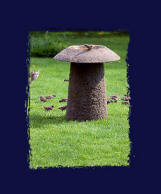 The traditional staddle stone, shown here in a Red sandstone  finishe, originally used to support timber floors and buildings for the storage of grains, thereby protecting the crop from rodents, now used as ornamentation lining drives and paths