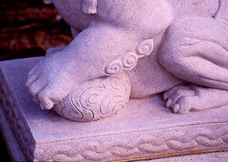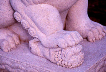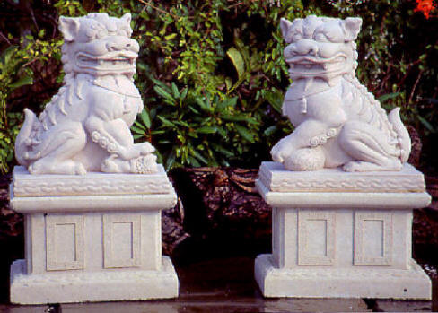 Two highly stylised and detailed foo-dogs on optional pedestals, shown in a moorland stone finish, probably the finest examples of their type in composite stone in the market today, designed and sculpted here at our Chester workshops in 2001, available in six regional stone finishes as standard.